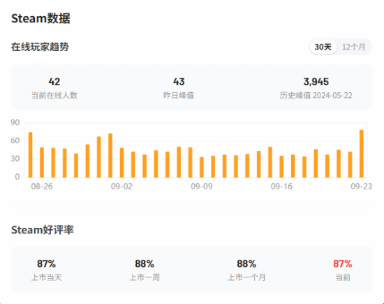 游民星空数据显示盈珑操盘,本作在Steam的好评率为87%,平均游戏时间为11.4小时。
