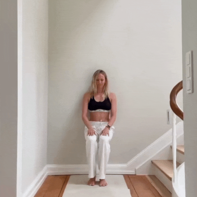 躯干臀部靠墙,双脚分开一拳的距离大小腿90度,将右脚放在左大腿上右大腿外旋,保持身体稳定停留20-30秒,交换另一侧