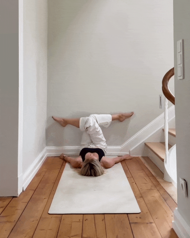仰卧在垫面上,双腿向两侧分开双脚放在墙壁上,如果家里有整面墙壁可以臀部双腿直接靠墙,仰卧在垫面双腿两侧分开,保持20-30秒