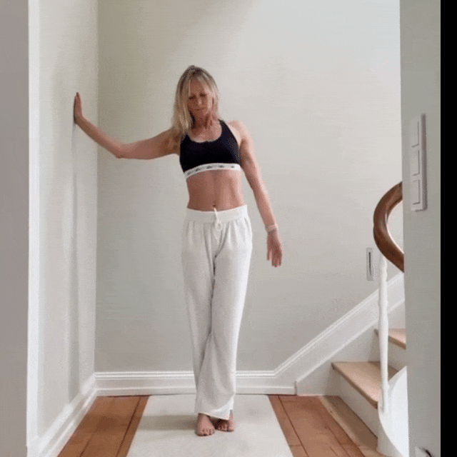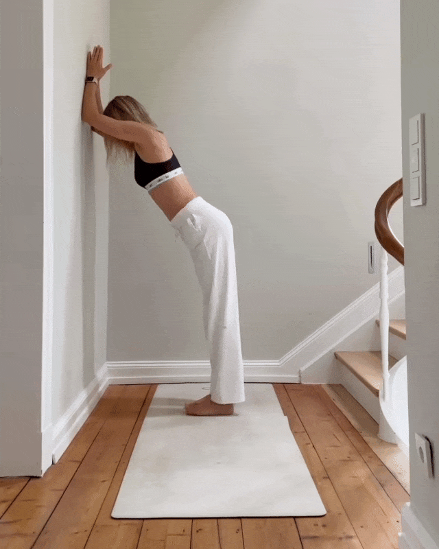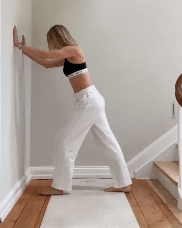 面对墙壁站立,距离墙壁两肩宽双脚分开与髋同宽,左脚向前一步脚尖到墙壁约两个拳头的距离双手在身体前侧墙壁上与身体等高呼气,屈左膝,小臂贴墙壁上保持20-30秒,交换另一侧