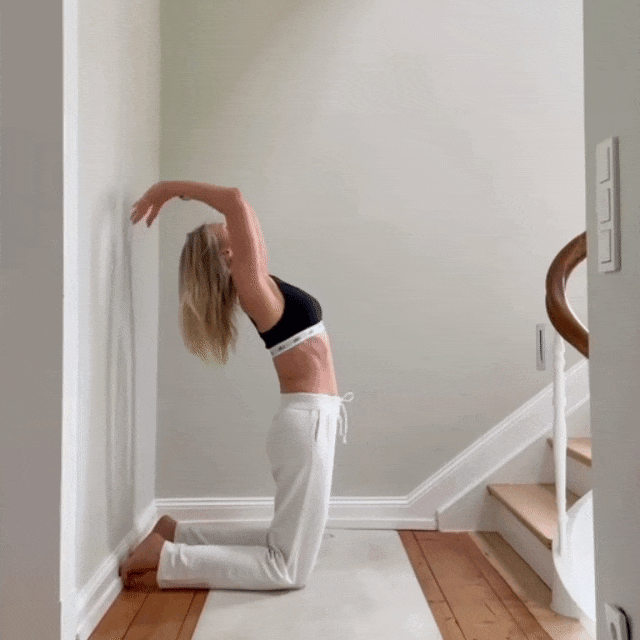 双脚抵墙,跪立在垫面上双腿分开与髋同宽,吸气,延展脊柱双手臂向上举过头顶呼气,保持髋部中立位,腹部核心收紧身体后弯,双手去摸墙壁注意不要塌腰翘臀保持20-30秒,摸不到墙壁保持即可