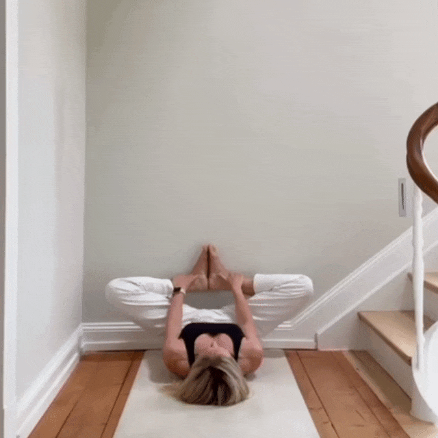 臀部双腿靠墙仰卧在垫面上屈双膝,双脚并拢,双腿向两侧打开双手握住脚踝,保持20-30秒双腿可以上下弹动