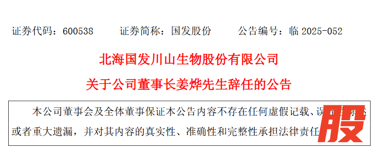公告称,辞任后,姜烨不再担任国发股份及控股子公司任何职务。根据相关规定,其辞职申请自国发股份收到通知之日起生效。