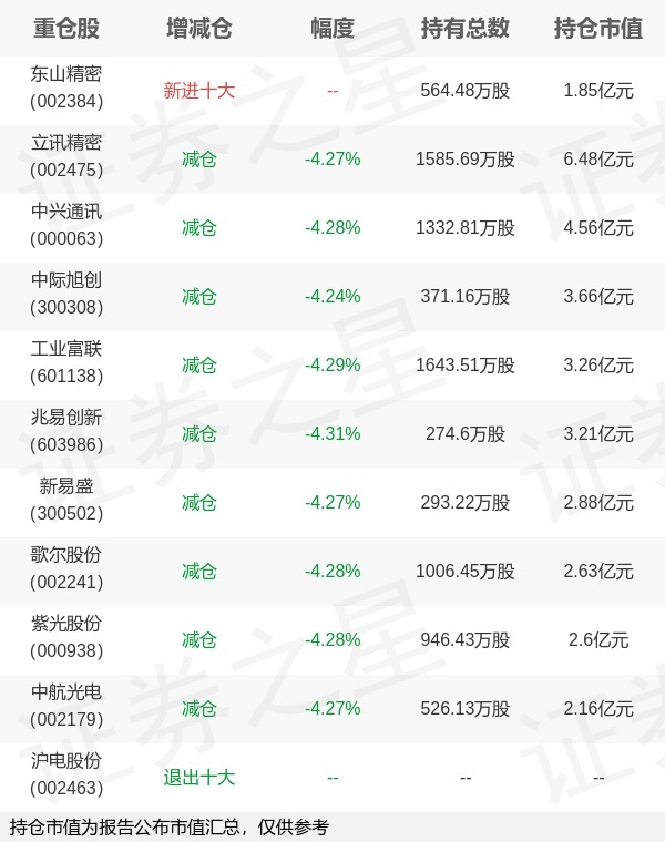 本站消息,4月22日华夏基金旗下李俊管理的华夏中证5G通信主题交易型开放式指数基金公布一季报涌融优配,近1年净值增长率10.81%。与上一季度相比,该基金前十大重仓股新增东山精密;其中立讯精密持仓占比10.08%,为该基金第一大重仓股;沪电股份等退出前十大重仓股;详细数据如下: