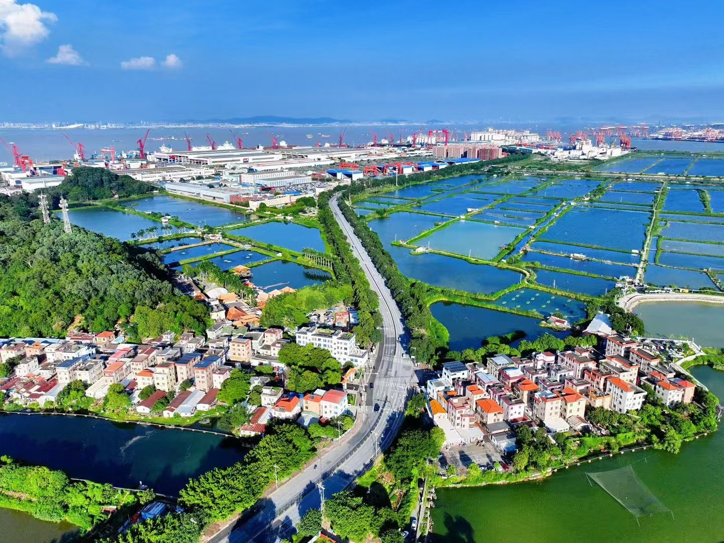四面环海,宛如一颗镶嵌在珠江口的璀璨明珠,连片的池塘如繁星洒落,波光潋滟。海岸边,码头巨轮穿梭不止宏融信,车流不息,数不胜数的标箱如同积木整齐排列,造船声轰鸣不断……