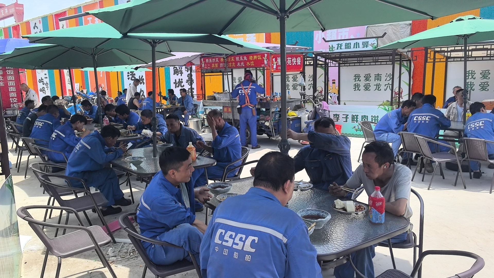 如今,走进海港夜市与龙船小驿,昔日边角地蝶变“金角银边”,传统文化与现代元素融为一体的建筑、敞亮的店铺、整洁的环境、灵活的机制,累计吸引80余家经营者进驻,涵盖饮食、奶茶、烧烤、快递、理发、驾校、文娱等多种业态,为龙穴船厂职工居民打造一站式夜间“吃、喝、玩、乐、购”新体验,每天高峰时段平均服务近千人次。