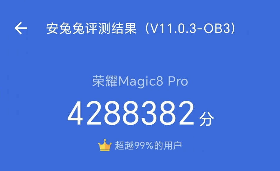 比如荣耀旗舰手机产品经理李坤晒出了荣耀Magic8 Pro的安兔兔跑分——4288382分,在室温环境下达成这一成绩,基本锁定行业性能榜首。